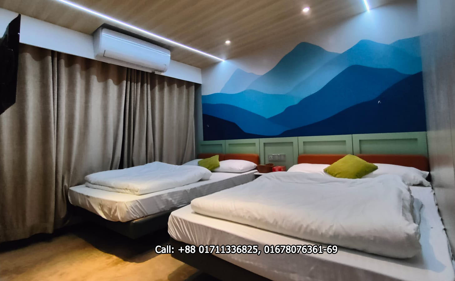 স্ট্যান্ডার্ড টুইনঃ এটাচ টয়লেট সহ, ৪ টি রুম – ২ জন করে।